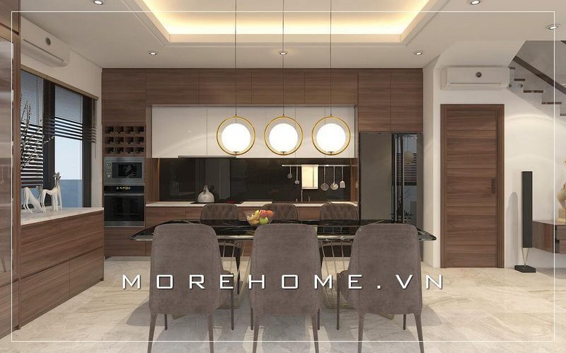 Mẫu tủ bếp gỗ công nghiệp thiết kế full trần kết hợp thiết bị phòng bếp đa năng, hiện đại tạo nên không gian nấu nướng tiện nghi cho người đầu bếp